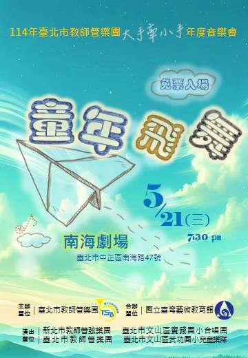 本校合唱團,受邀於5月21日晚間7:30,在南海學園(南海劇場),與臺北市教師管樂團、新北市教師管弦樂團、武功國小兒童樂隊,共同擔綱演出"大手牽小手-童年飛舞"音樂會。本次活動免票入場,歡迎大家踴躍前往欣賞,並給予本校合唱團小朋友們支持和鼓勵~~