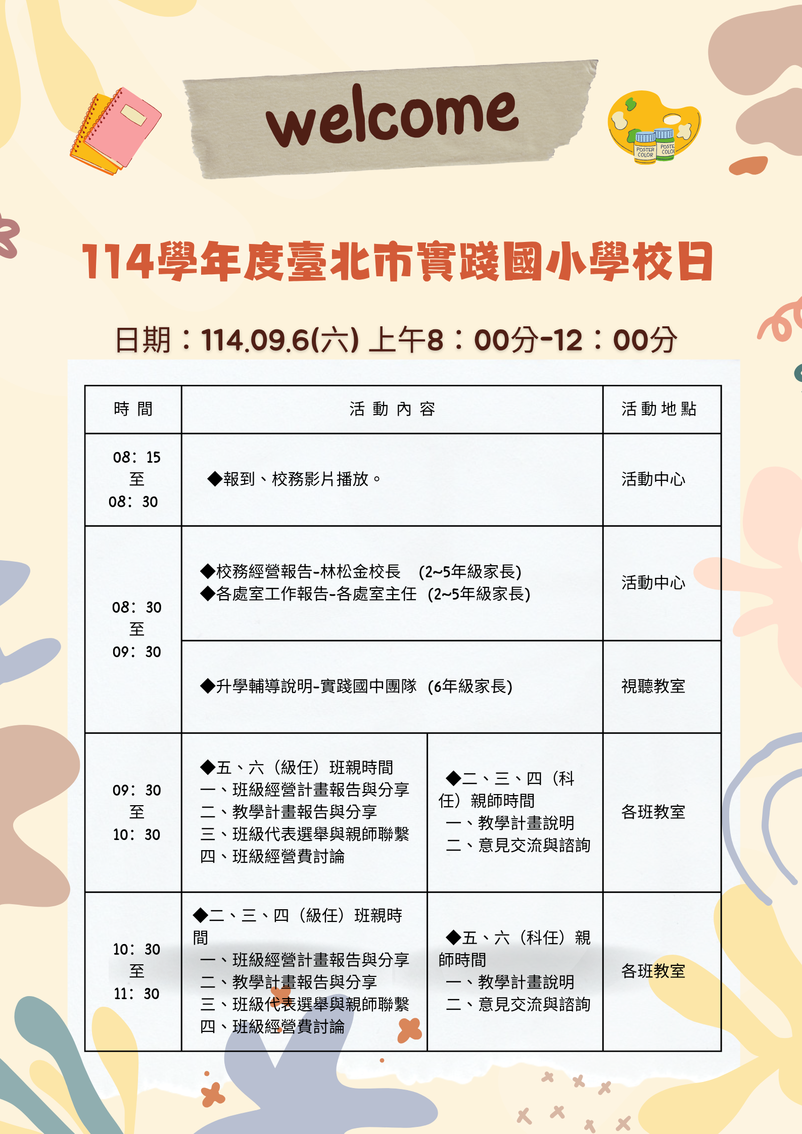 歡迎家長參與二~六年級學校日活動,目前本校規劃於114年9月6日(星期六)上午辦理,學校日相關資料請至學校日專區參閱(學校日專區資料將於本月中陸續更新)。