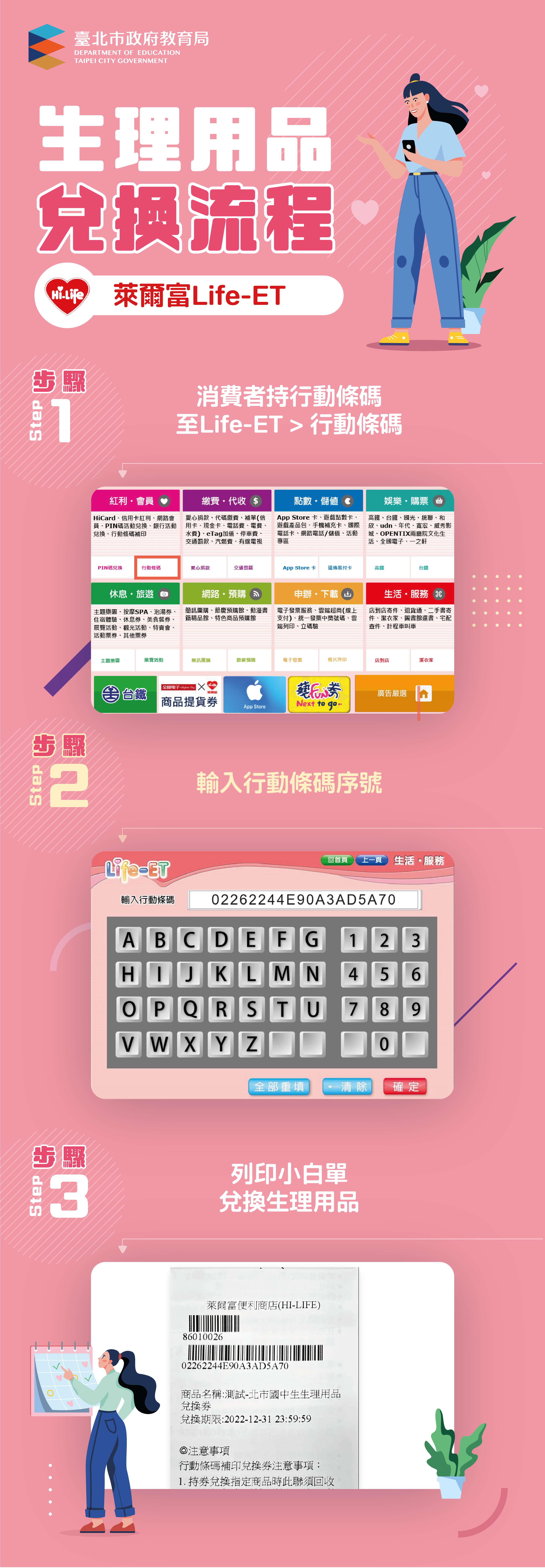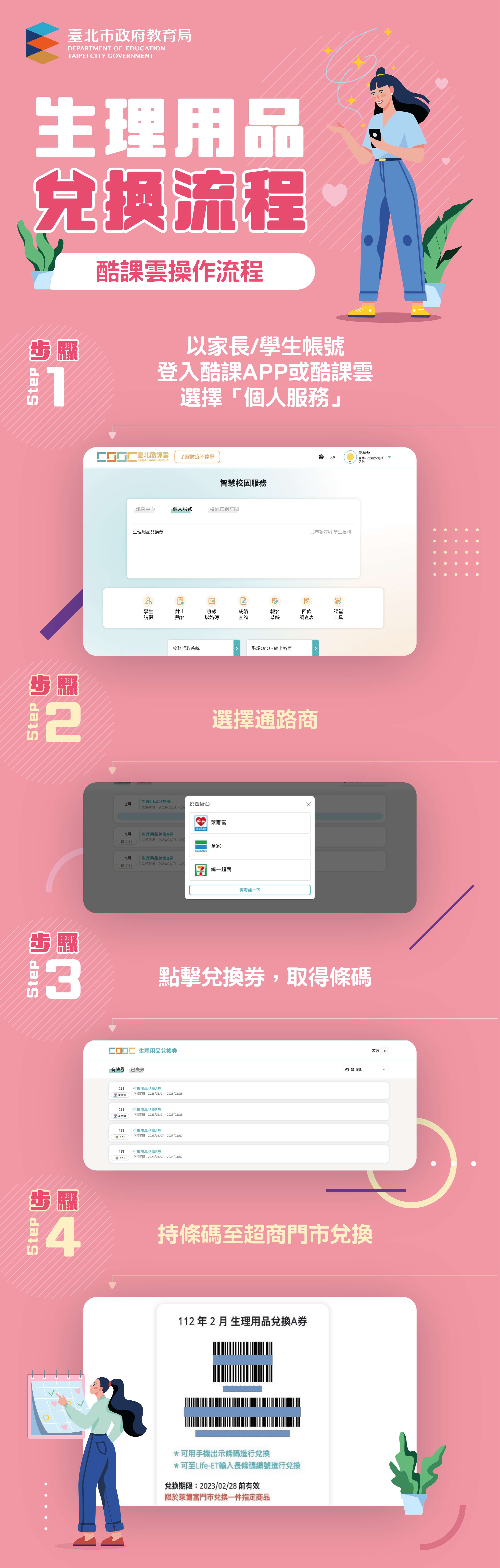 「112年國中小女性生理用品補助計畫」第1期兌換券2張, 將於3月1日發放,兌換效期至112年4月30日止。兌換方式與流程,重點摘述如下: