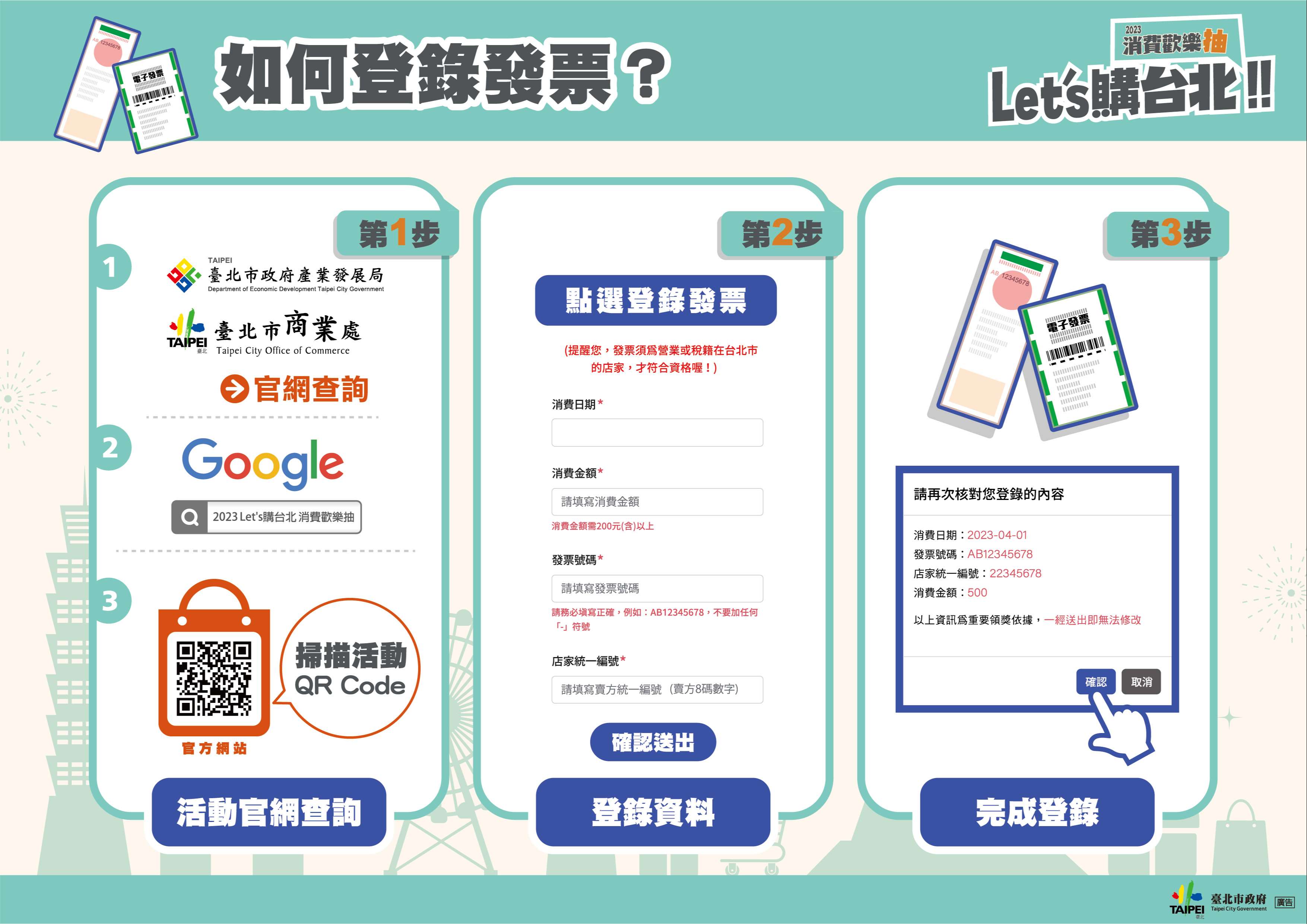 二、為響應中央普發新臺幣6,000元之政策,鼓勵民眾於臺北消費,本府自112年4月1日至112年5月31日辦理「2023Let's 購台北消費歡樂抽」消費抽獎活動,消費登錄週週抽、四月抽、總抽、學生加碼抽、雲端發票早鳥加碼抽、市民專屬加碼抽及母親節感恩抽等活動,並透過串聯本市超過1,000間以上友好特店,整合政府與民間資源共同行銷合作,以吸引民眾至本市遊逛消費,有效刺激購物,提升整 體買氣,共同活絡本市商業發展。