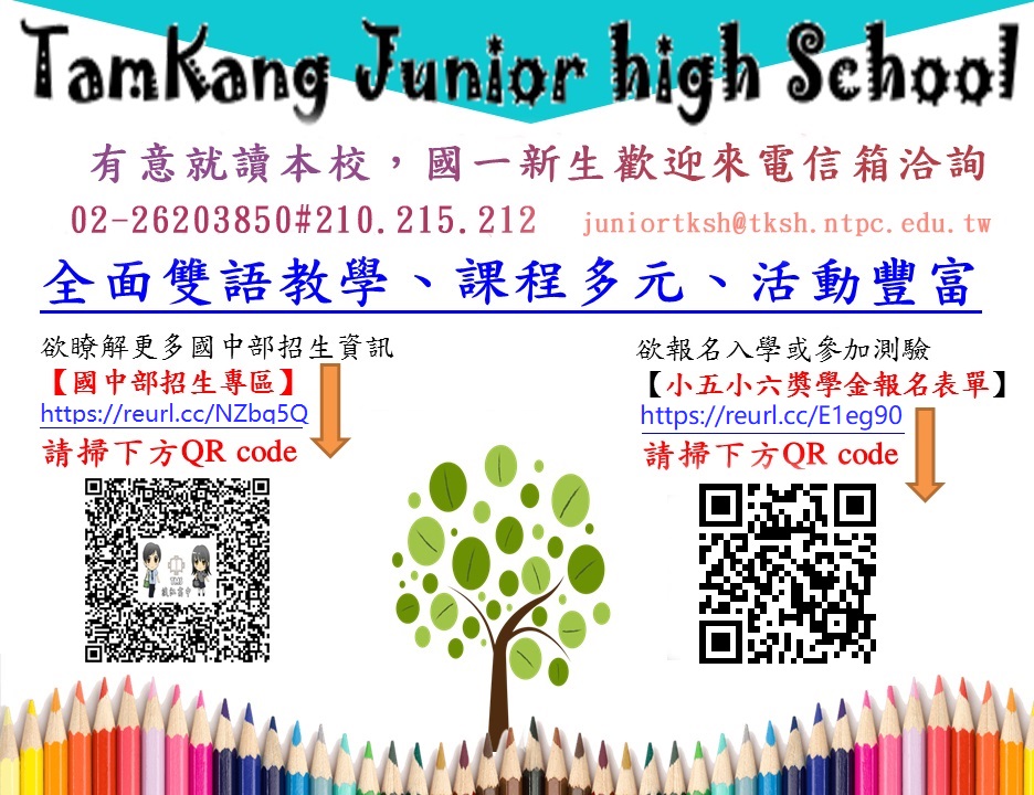一、私立淡江高級中學附設國中部訂於113年3月2日(星期六)上午舉辦小五小六獎學金測驗暨家長說明會,歡迎 小五、小六學生及家長報名參加。