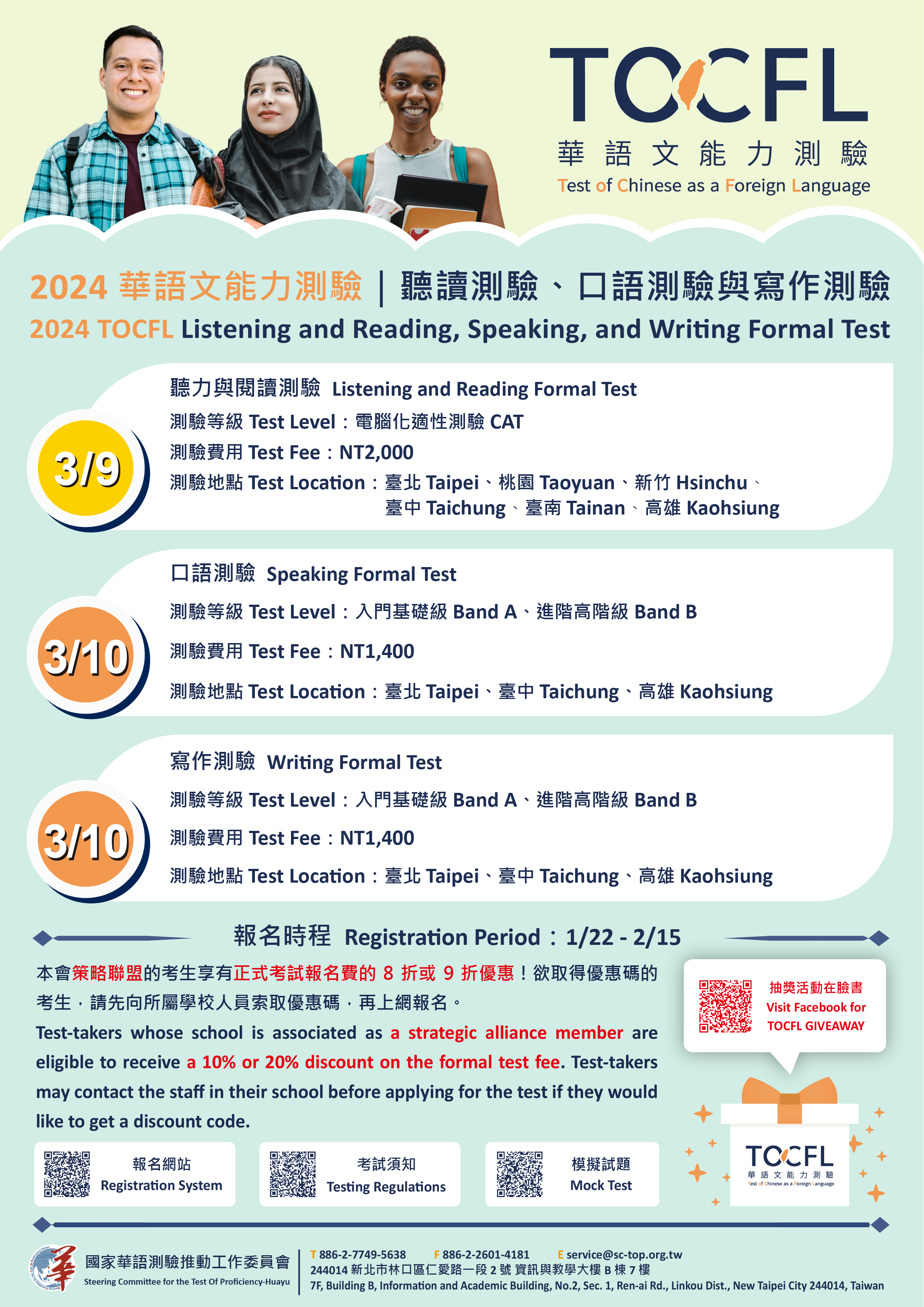 五、抽獎活動:凡報考任一測驗並完成繳費者,可參加華測FB粉絲專頁抽獎活動。詳情請見粉絲專頁貼文: https://www.facebook.com/SCTOP.TOCFL