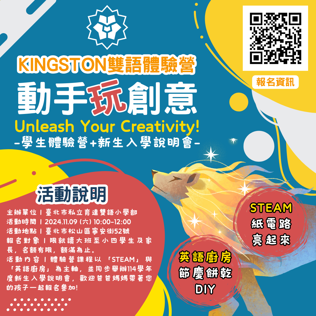 點燃孩子的創意火花--【動手玩創意-Kingston雙語體驗營】。在全球化的時代,雙語能力是孩子未來發展的重要資產,本次Kingston雙語體驗營集結本校外師與中師,以「STEAM」與「英語廚房」為主題,設計一系列豐富有趣的體驗課程,除了規劃精采的手作體驗與科學實驗, 也在同一時間安排114學年新生入學說明會,深入介紹學校的課程規劃與環境導覽,並解答家長的所有疑問,歡迎家長帶著您的孩子一起報名參加!
