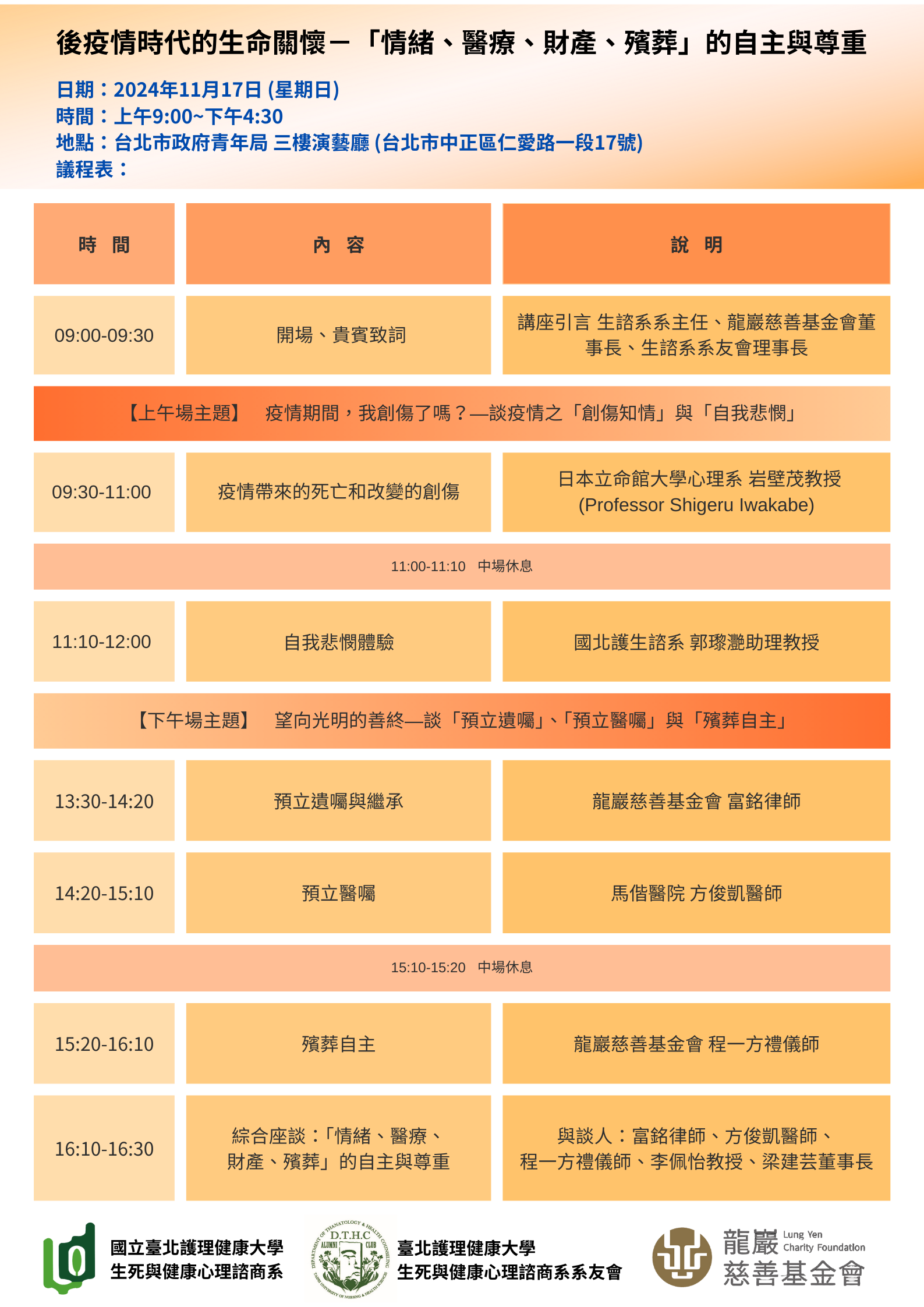 一、講座主題:「後疫情時代的生命關懷—『情緒、醫療、財產、殯葬』的自主與尊重」。