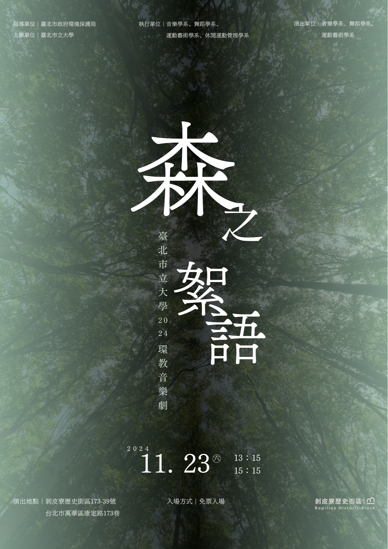 一、都市發展與綠色空間保存間的平衡是當代重要課題,由臺北市立大學音樂學系、舞蹈學系、運動藝術學系及休閒運動管理學系共同舉辦「環境教育-《森之絮語》音樂劇」展演,透過音樂劇引導觀眾反思永續發展的重要性,持續為環境保護盡一份心力。為達教育及推廣目的,敬邀貴校師生一同參與欣賞。