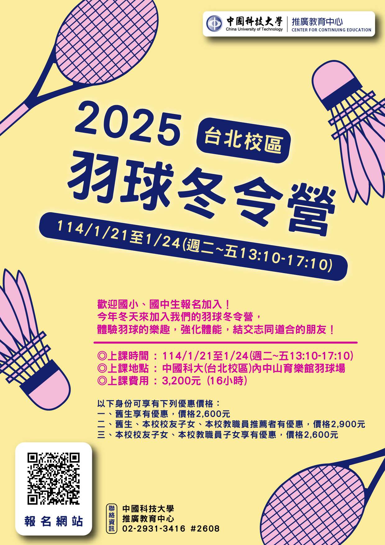 二、旨揭「2025羽球冬令營」謹訂於114年1月21日至114年1月 24日(13:10-17:10)間辦理。