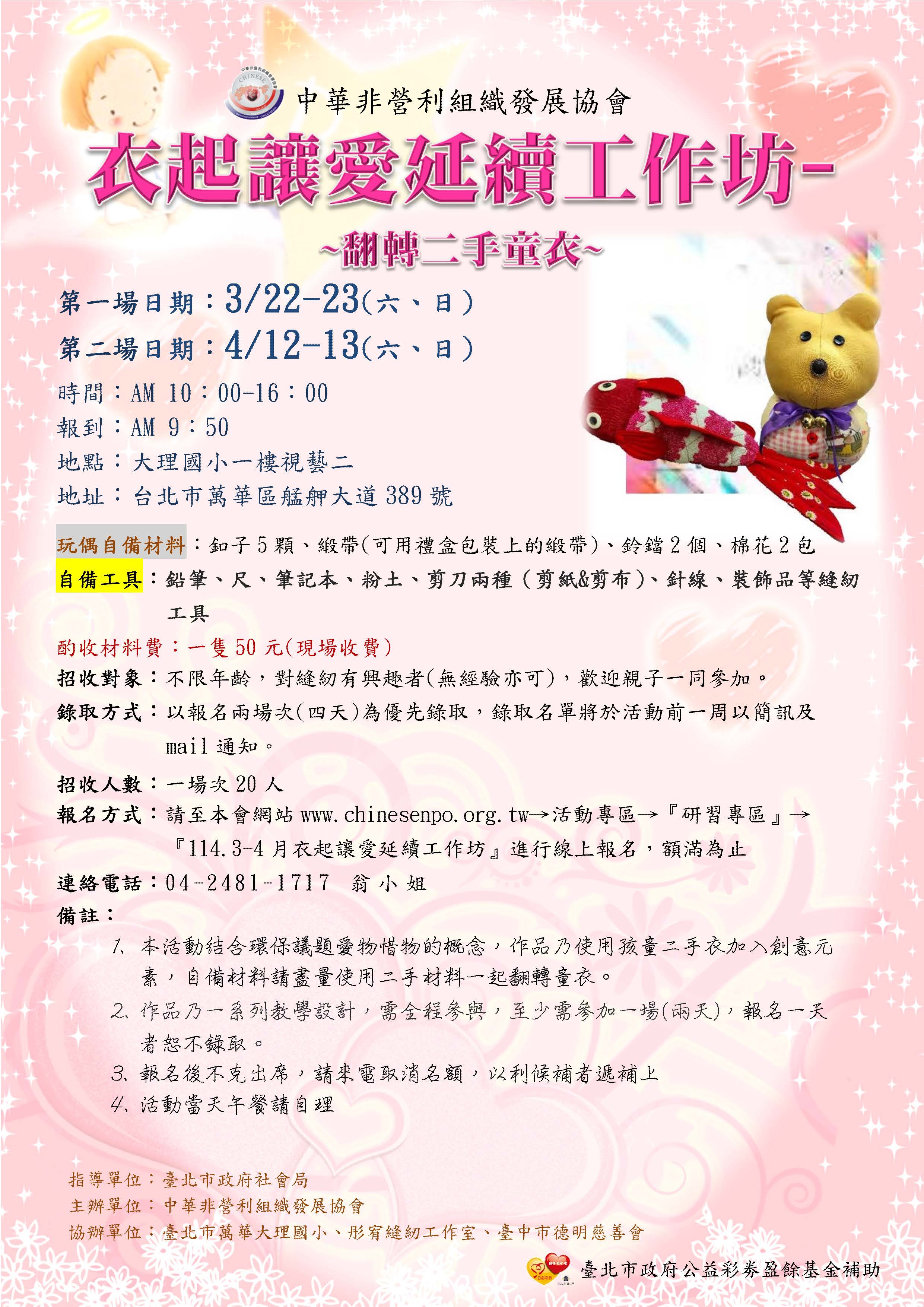 六、報名方式:請至本會網站www.chinesenpo.org.tw→活動專區→『研習專區』→『114.3-4月衣起讓愛延續工作坊』進行線上報名,額滿為止