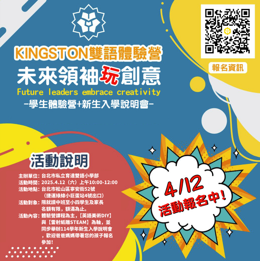 一、目的:【未來領袖玩創意-Kingston 雙語體驗營】在全球化的時代,創造力與雙語能力是孩子未來發展的重要資產, 本次Kingston雙語體驗營集結本校外師與中師,以「雷射紙雕STEAM」與「英語美術DIY」為主題,設計一系列豐富有趣的體驗課程,我們也在同一時間安排114學年新生入學說明會,深入介紹本校的課程規劃與環境導覽,並解答您的所有疑問,歡迎家長帶著您的孩子一起報名參加!