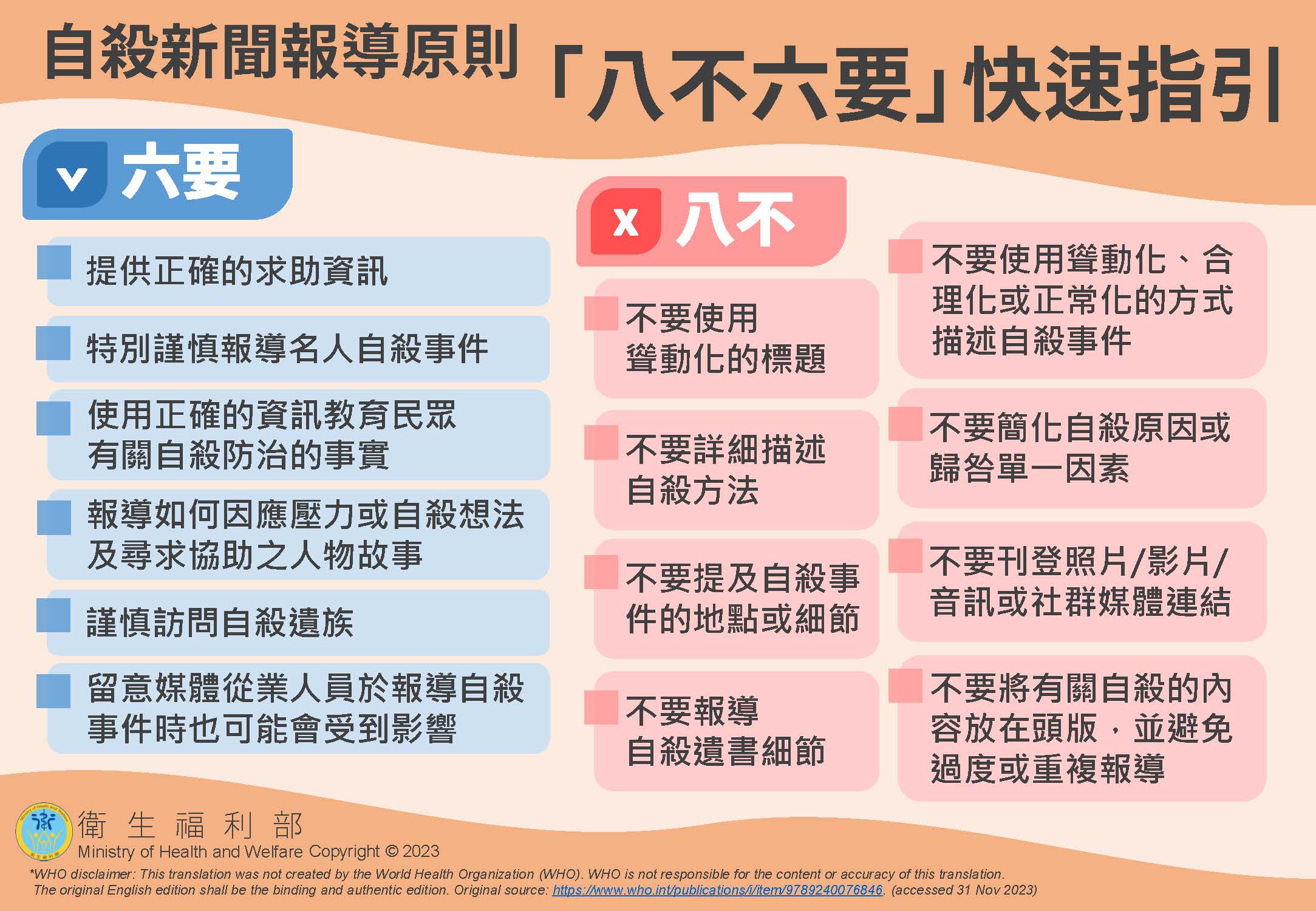 一、旨揭平臺係為協助相關機關落實網路不當內容防護機制, 並利民眾針對網路不當內容進行申訴及獲取相關機關之回應,以協助傳播媒體及網際網路平臺業者遵循自殺防治法第16條規定,並依世界衛生組織自殺新聞報導原則「八不 六要」建立自律機制。