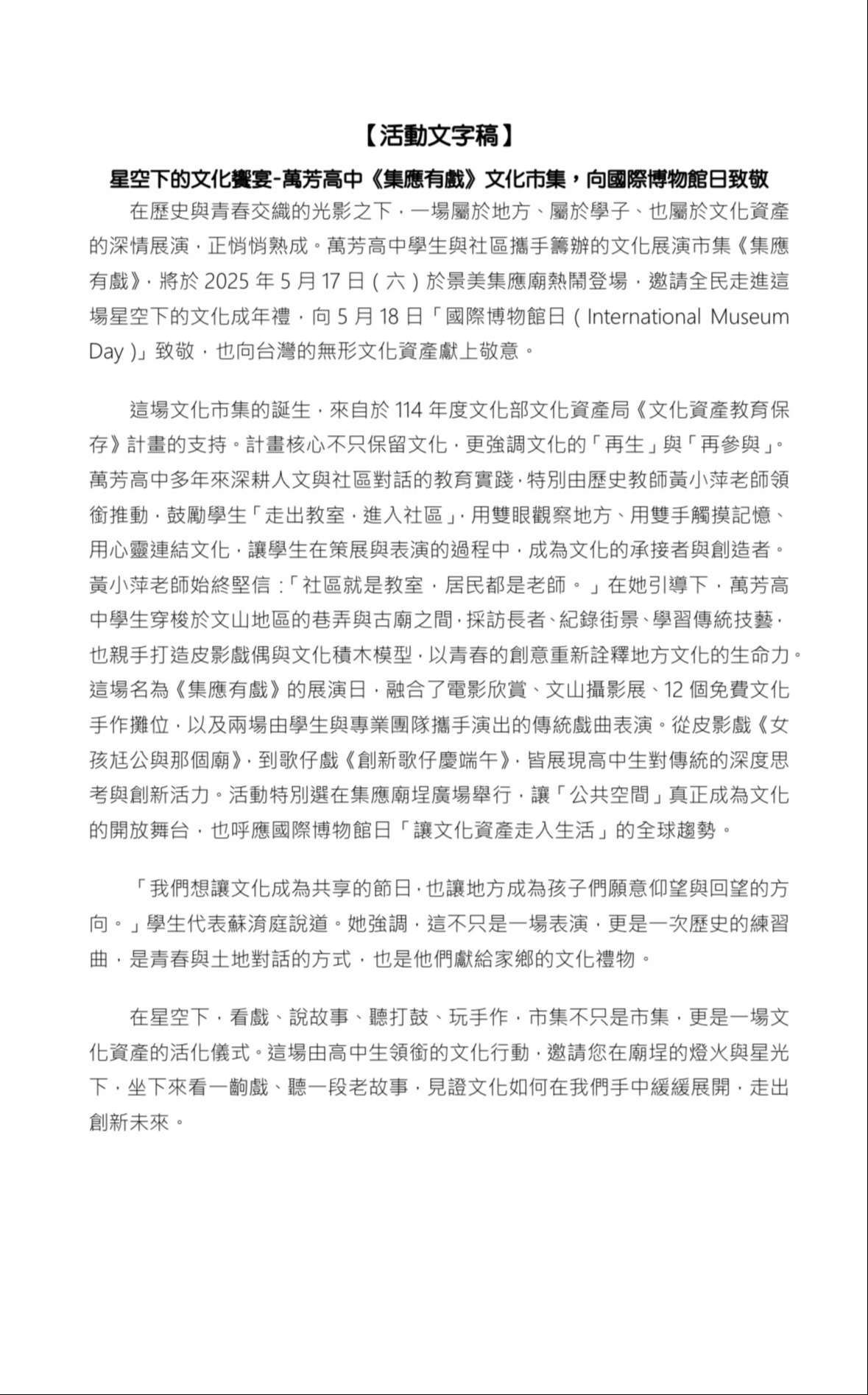 二、北市萬芳高中申辦文化部文化資產局「113學年度文化資產保存教育推動計畫」,辦理系列活動-《集應有戲》,活動資訊如下:
