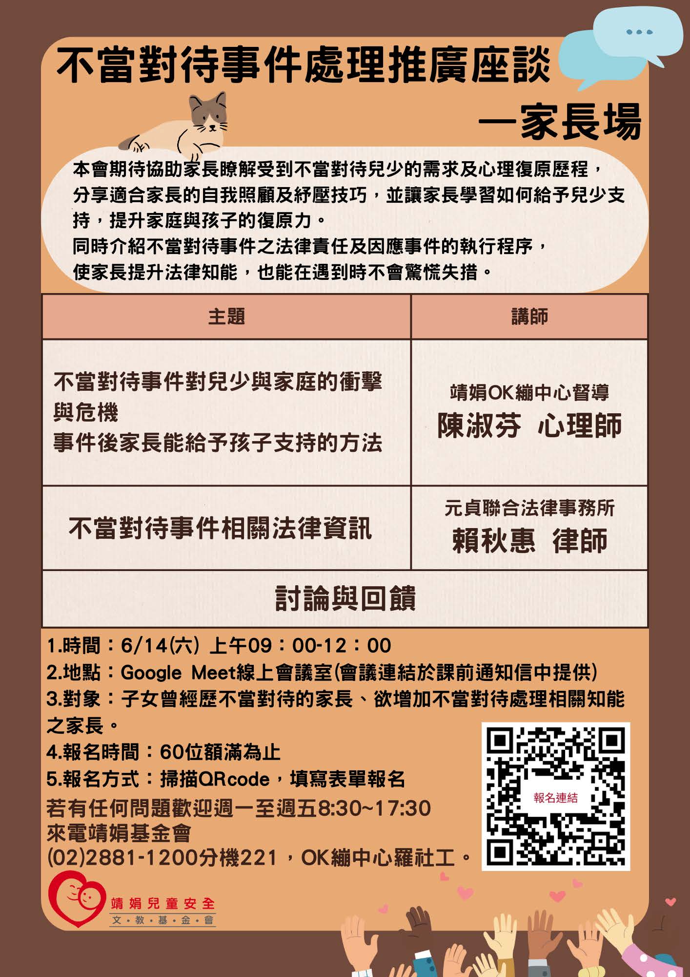 以座談的方式與家長分享受到不當對待兒少的需求、心理復原歷程及適合家長的自我照顧、紓壓技巧,並讓家長學習如何給予兒少支持,提升家庭與孩子的復原力。同時介紹不當對待事件之法律責任及因應事件的執行程序,使家長提升法律知能,也能在遇到時不會驚慌失措。