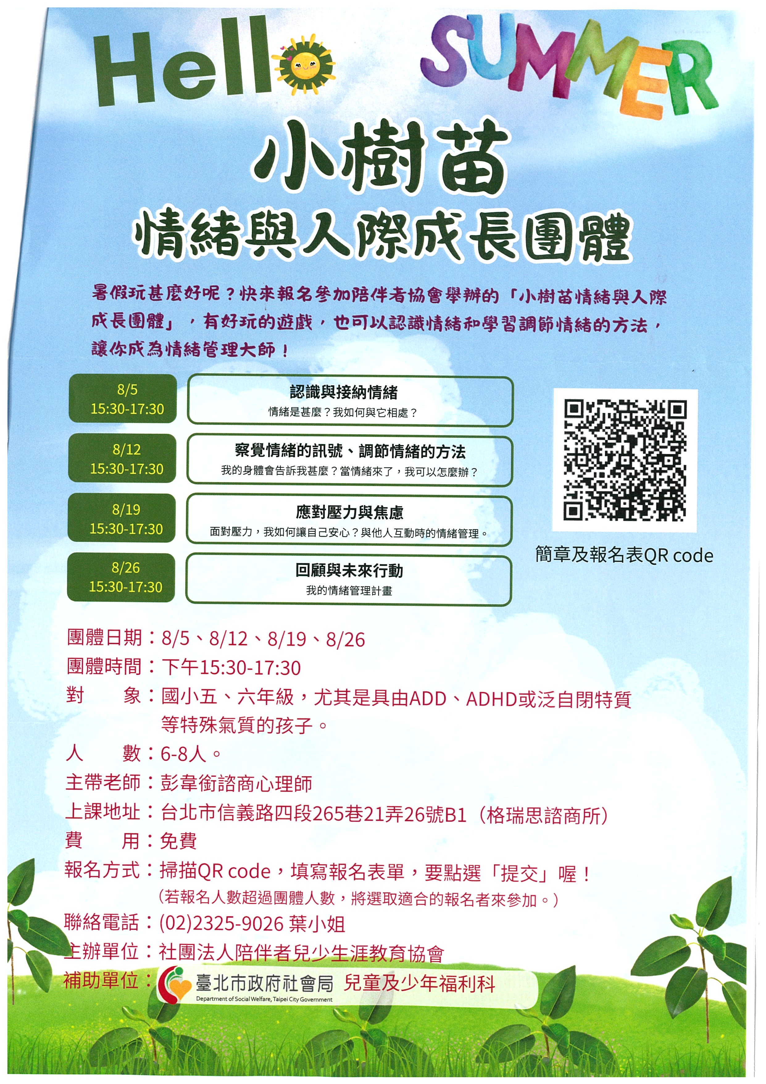 一、為協助具特殊氣質或情緒困擾之學童學習情緒覺察、情緒調節,提升自我控制能力,以改善其人際互動及提升生心理韌性,社團法人陪伴者兒少生涯教育協會辦理「114年度小樹苗兒童情緒與人際團體」。