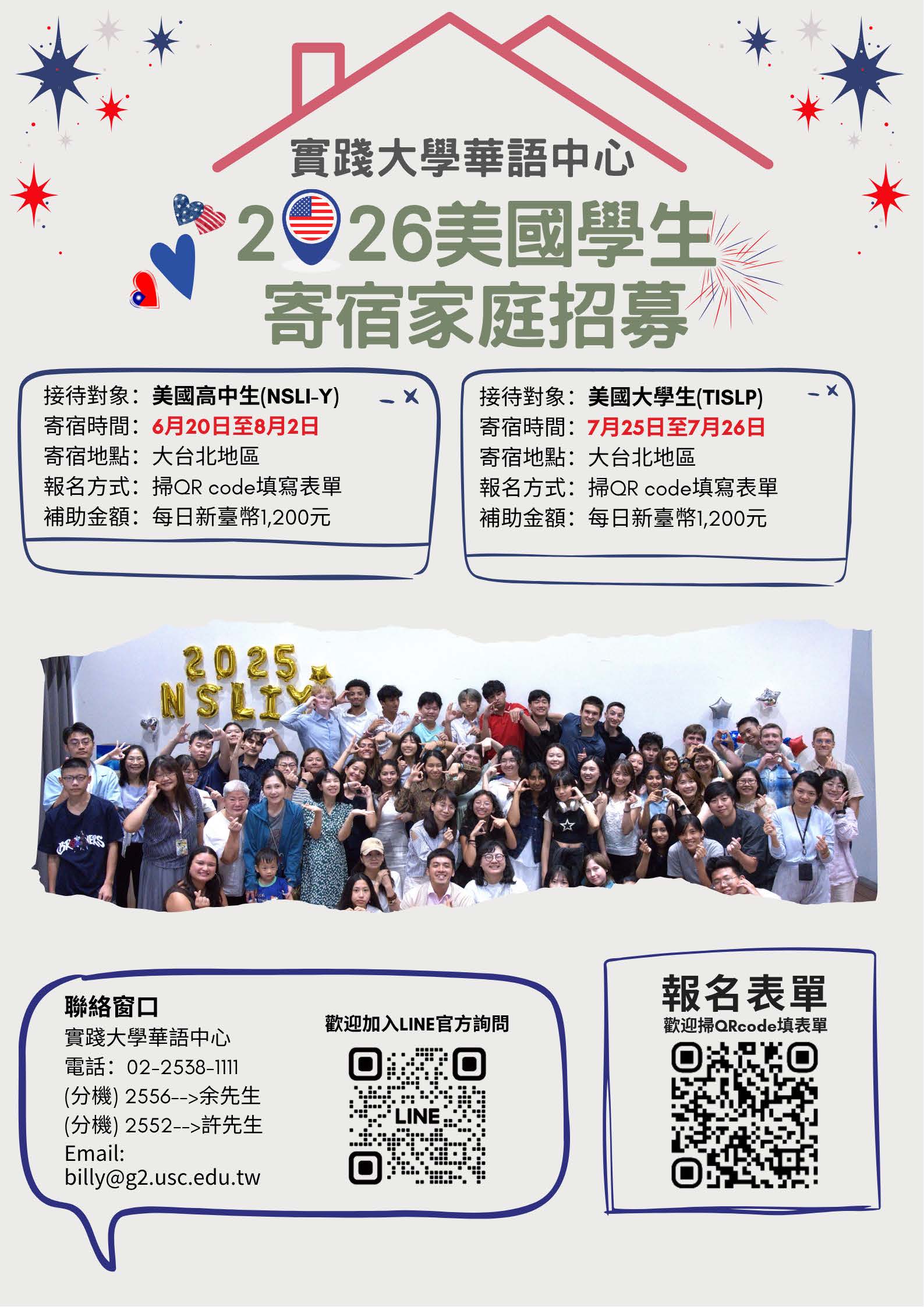 實踐大學國際事務處華語中心為辦理「美國國務院NSLI-Y高中 生華語獎學金研習班」及「美國大學生密集華語獎學金研 習班(TISLP)」,需徵選臺灣寄宿家庭。